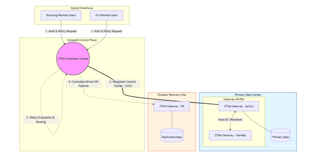 InstaSafe Controller is one of the key modules in the InstaSafe Cloud infrastructure that enforces access control for network connectivity. It is also the central point to which InstaSafe User Agent and Gateway Agent establish independent DTLS tunnels. It enforces policies and accepts/denies application access based on the configured policies.