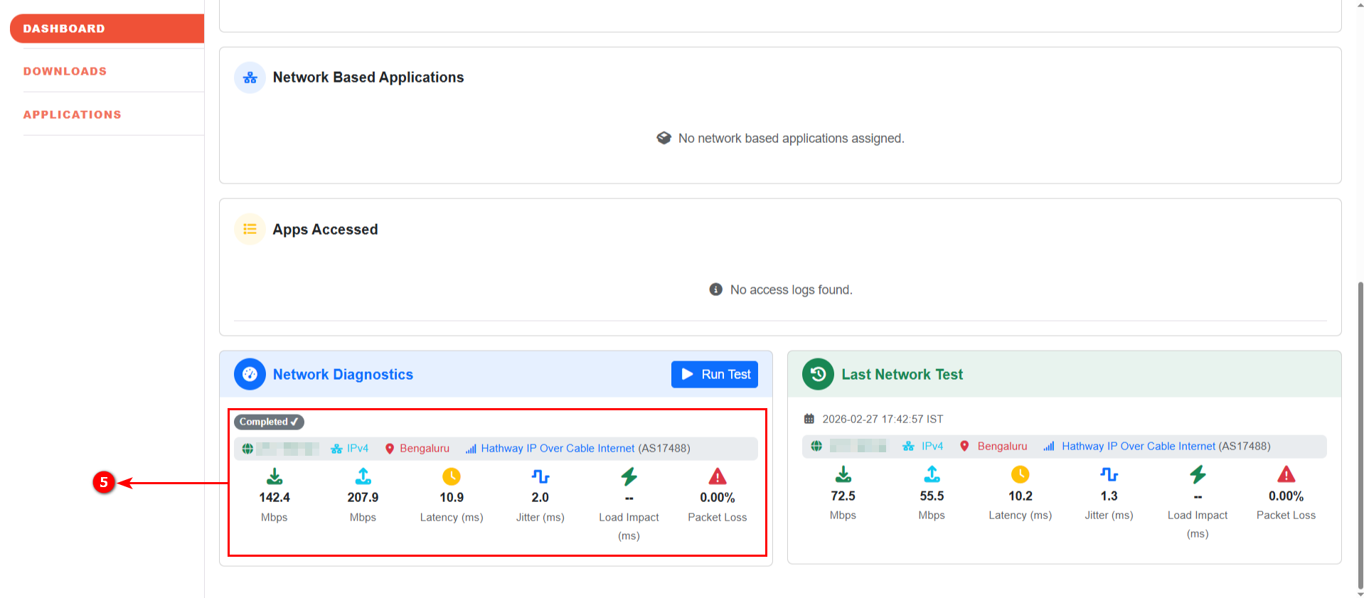 - Real-time network performance testing from the User Portal dashboard