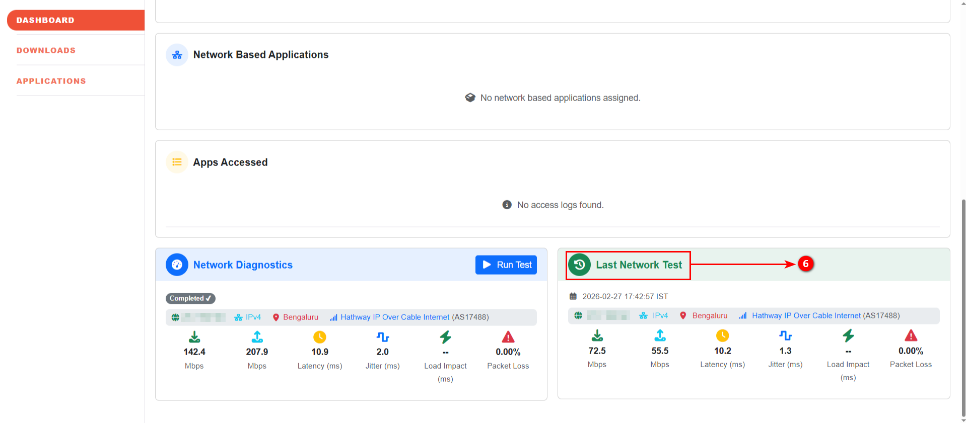 Network Diagnostics is a built-in troubleshooting feature available within the InstaSafe User Portal (Console). It enables users to run real-time network performance tests directly from the dashboard to identify connectivity or performance issues affecting secure application access.