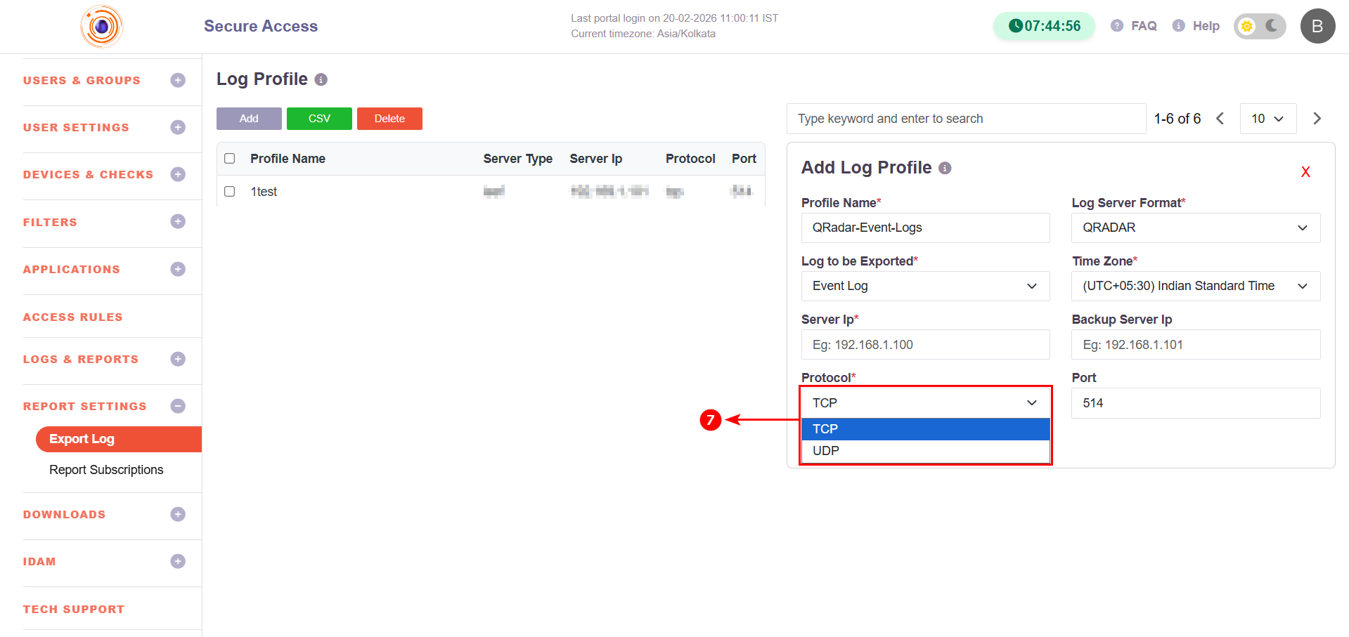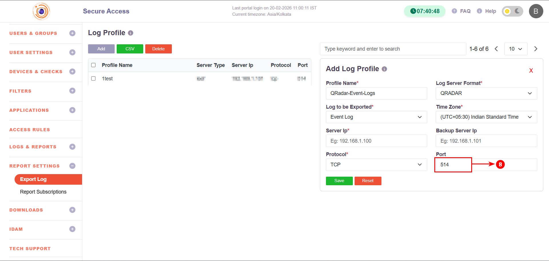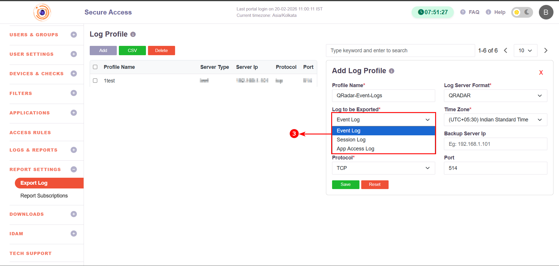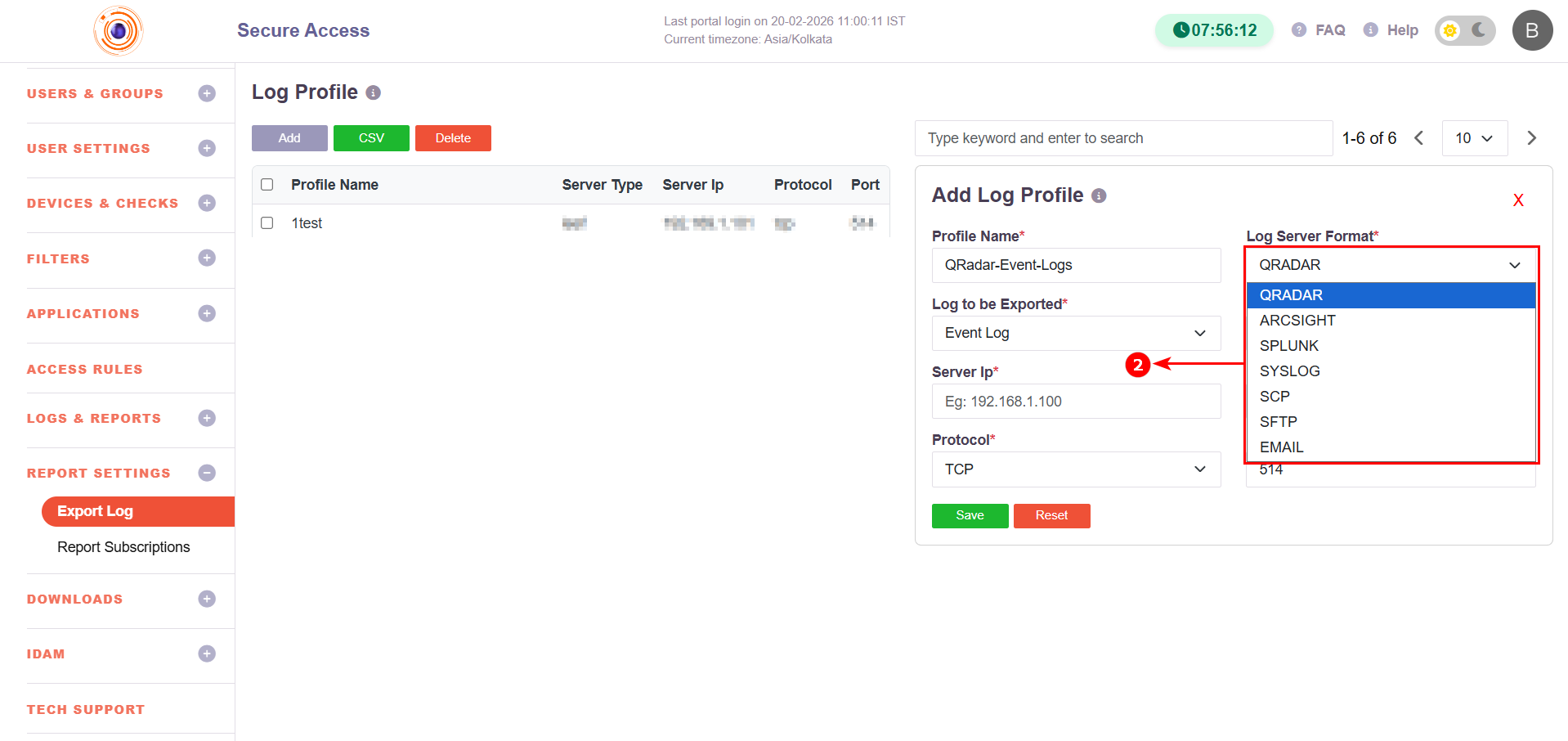 The Log Export feature enables centralized log monitoring by forwarding InstaSafe logs to external SIEM platforms or secure transfer destinations. By configuring a Log Profile, administrators can select the log type, format, protocol, and destination details to meet monitoring and compliance requirements.